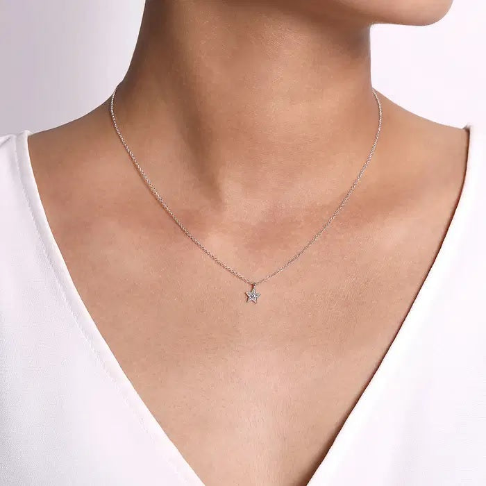 This 14K white gold star pendant necklace, finished with rhodium for enhanced shine and durability, features 0.06 total carat weight of round diamonds. Designed by Gabriel New York, it combines expert craftsmanship with a timeless celestial motif, making it a refined choice for everyday elegance or special occasions.