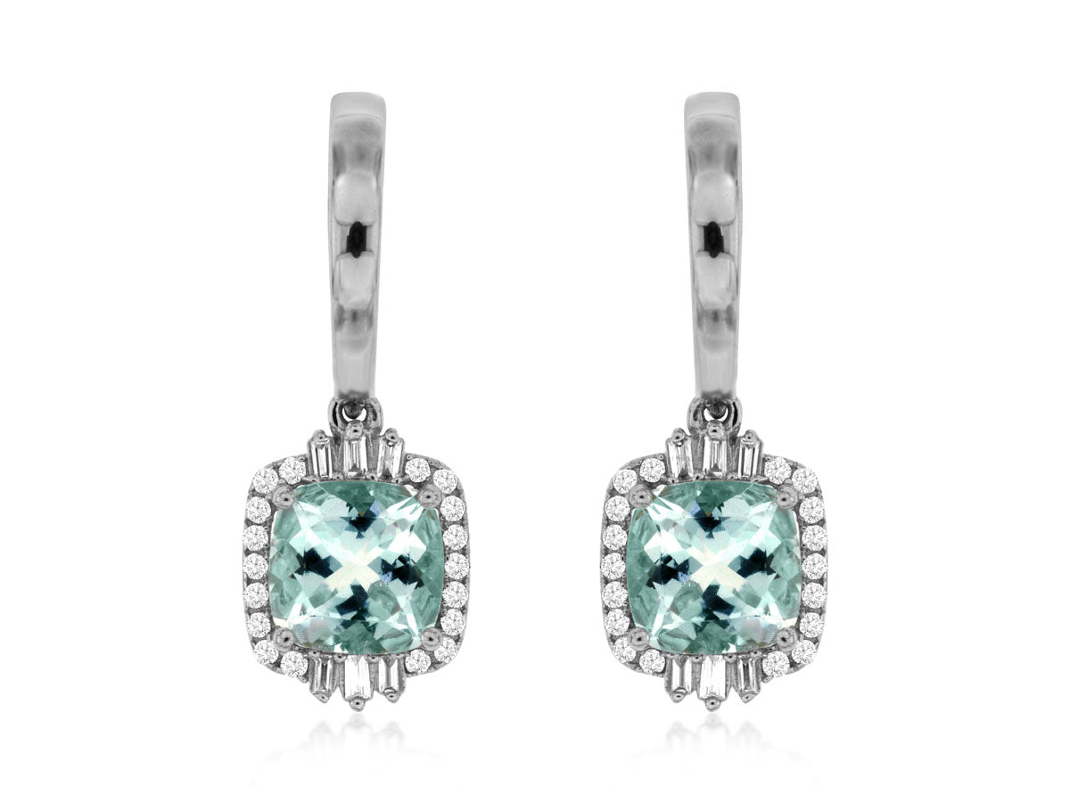 WHITE 14 KARAT RHODIUM FINISH HUGGIE HOOP CUSHION HALO DROP EARRINGS 2 = 2.70TW CUSHION AQUAMARINES
