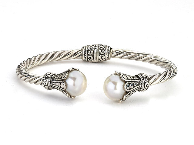 Our Sterling Silver bali twist hinged fresh water pearl bangle, handcrafted in Bali by our skilled artisans. The Gems of the Sea collection is inspired by the beauty of the white beaches, sparkling sea and the flourishing coral reefs of Bali.