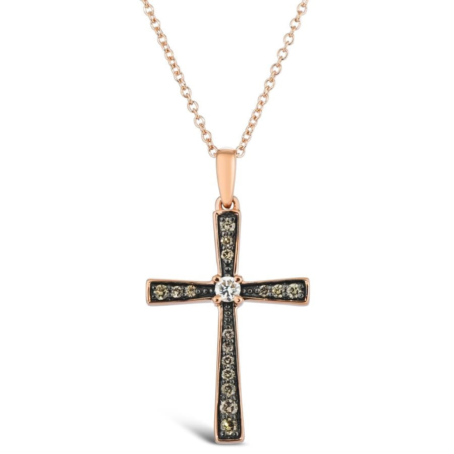 Crafted in 14K gold, this pendant features a refined cross design accented with Vanilla Diamonds® totaling 1/20 carat and rich Chocolate Diamonds® totaling 1/6 carat. Its expert craftsmanship highlights the unique contrast between the creamy Vanilla and warm Chocolate Diamonds, creating a sophisticated piece that balances elegance with subtle color depth. Ideal for those seeking a meaningful symbol with a distinctive, luxurious touch.