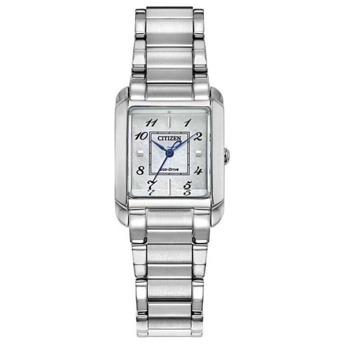 Classic lines and subtle sophistication make this latest piece to our women’s collection, the Citizen L Bianca, a charming addition of sustainable luxury. With a design inspired and celebrating feminine motifs in art deco, the distinctive stainless-steel timepiece is a captivating accent on the wrist that's perfect for everyday wear. A curved rectangular shape defines the watch's 22mm silhouette, with a subtle crown and stainless-steel bracelet rounding out the look. On its mother-of-pearl dial, alternating applied and printed markers work with a pair of blue-touched hands for a highly aesthetic style, with its printed inner square once again pointing to chic inspirations. Sustainably powered by any light with our proprietary Eco-Drive technology that never needs a battery, this elegant ladies’ watch is the perfect addition to any outfit. Water resistant to 50 meters. Caliber B035.