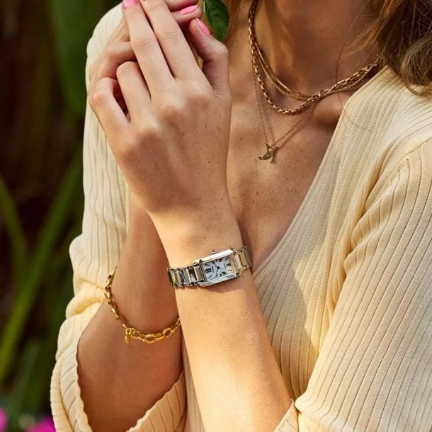 Classic lines and subtle sophistication define the Citizen L Bianca. Sustainably powered by any light with our proprietary Eco-Drive technology, this timepiece never needs a battery. Measuring 32.5mm, the silver-tone stainless steel rectangular case is accented by a curved sapphire crystal and a crown adorned with a refined blue cabochon. A matching stainless steel bracelet enhances the graceful, jewelry-like presence on the wrist. On the crisp white dial, a mix of applied and printed Roman numerals offers a classic charm, while slender blue hands track the hours and minutes with effortless clarity. The blue seconds hand is finished with a stylized “L” counterweight, nodding to our Citizen L collection. Water resistant up to 50 meters. Caliber B035.