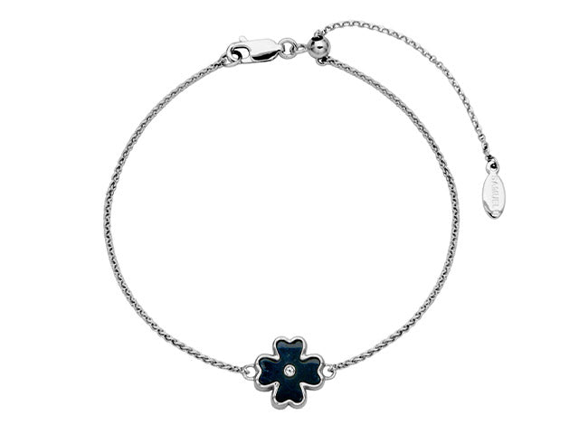 This distinctive bracelet features a striking quatrefoil design crafted in sterling silver, showcasing a genuine sodalite stone measuring 10x1x2.8mm accented with brilliant white topaz. The deep blue sodalite provides rich color contrast against the luminous topaz, creating visual interest and sophistication. The quatrefoil motif adds architectural elegance to this piece, appealing to collectors who value distinctive gemstone combinations and refined metalwork. A versatile addition to any jewelry collection, this bracelet balances bold design with understated luxury.