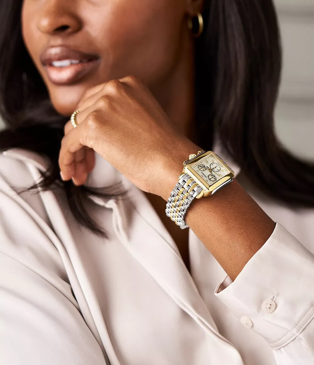 The rectangular case of the Deco two-tone 18K gold diamond dial watch reflects the geometric shapes identified with Art Deco architecture. This iconic Swiss chronograph timepiece features 12 brilliant diamonds atop the mother-of-pearl dial, three subeyes accented with gold foil and engraved MICHELE logos within the case walls. A two-tone 18k gold seven-link bracelet adds the finishing touch and is interchangeable with any 18mm MICHELE strap.