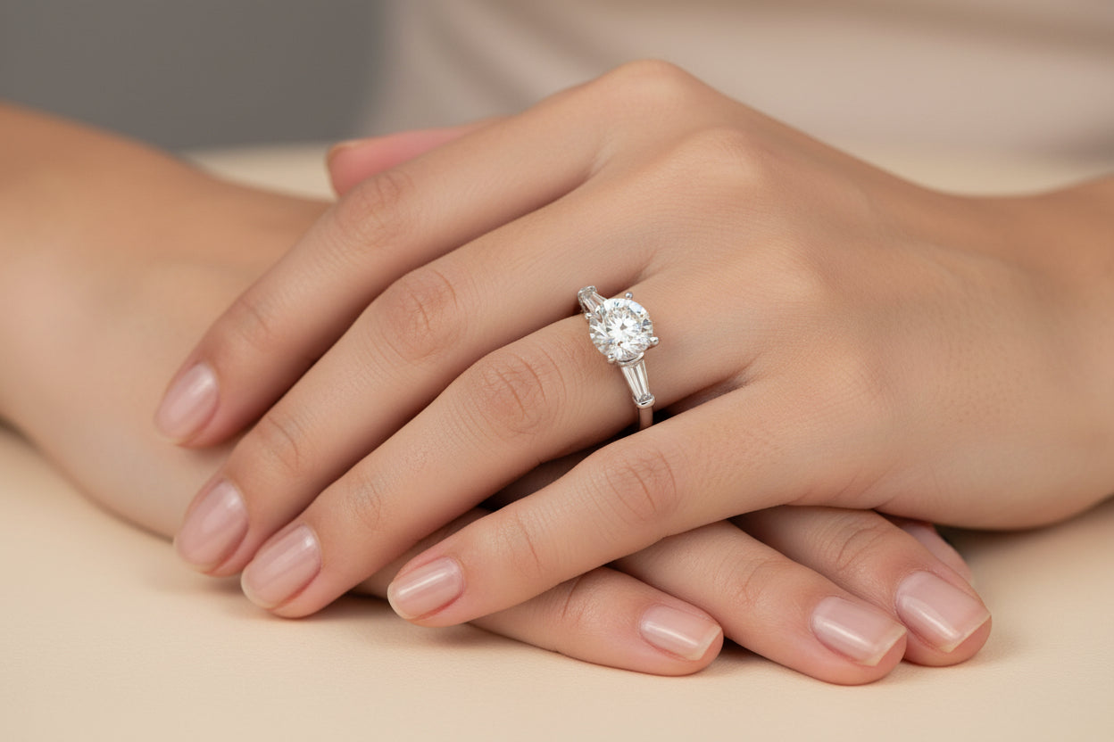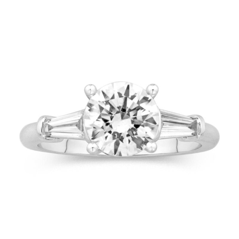 Elevate your engagement with this sophisticated three-stone ring crafted in 14K white gold. The design features a classic round basket head mounting at its center, complemented by baguette-cut diamonds on either side. Set with 0.28 carats total weight of H color, SI clarity diamonds, this piece combines timeless elegance with expert craftsmanship. The baguette stones add refined geometry and sparkle, while the secure basket setting ensures your center stone remains the focal point. A versatile choice for engagements, anniversaries, or as a meaningful right-hand ring.