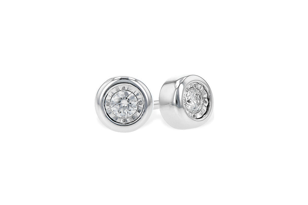 Crafted with expert precision, these white 14-karat gold stud earrings feature a rhodium finish that enhances their durability and shine. The bezel illusion setting beautifully frames 0.10 total carat weight of round diamonds, offering a refined and elegant look. Designed by Allison-Kaufman, these earrings combine timeless style with subtle sophistication, perfect for everyday wear or special occasions.