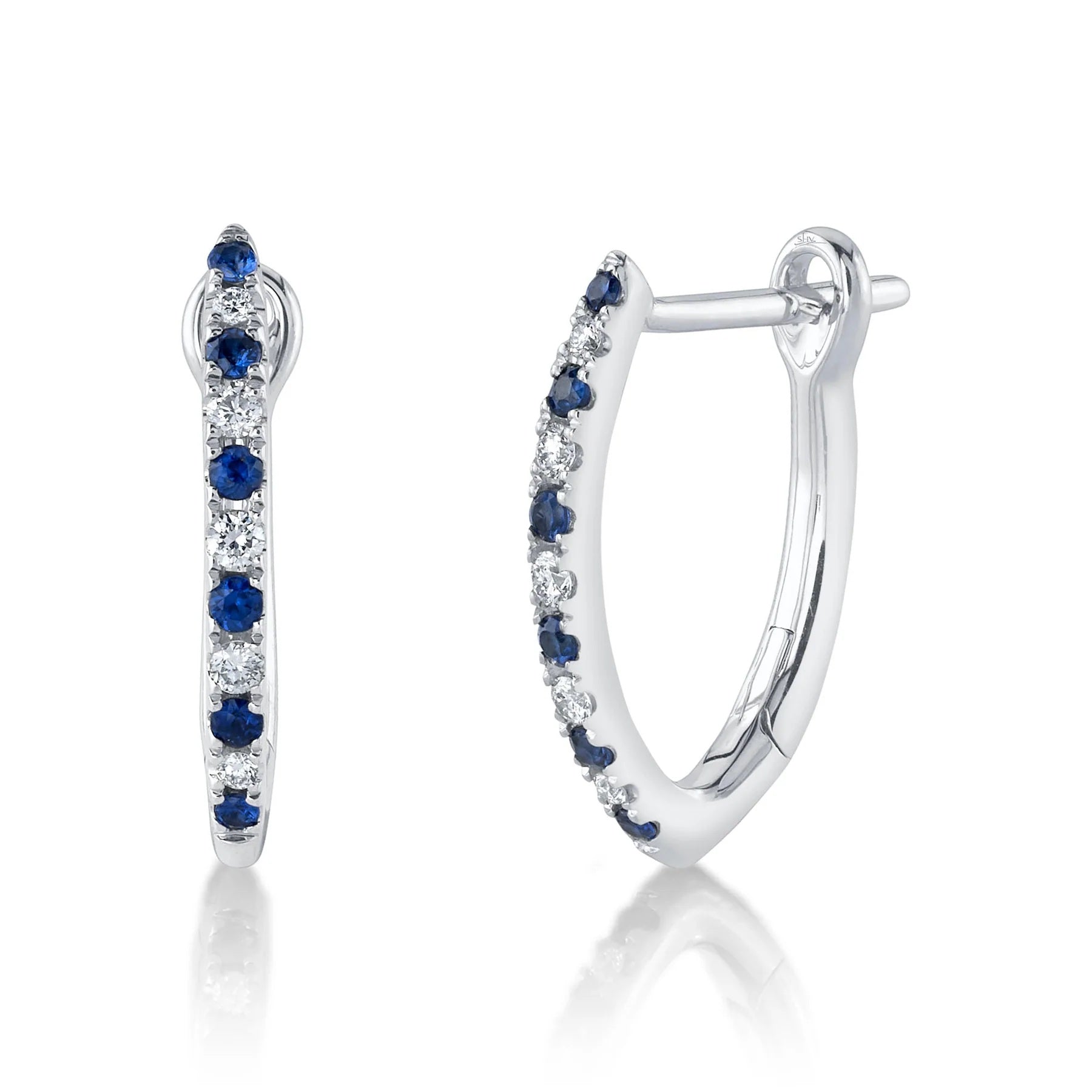 These elegant oval hoop earrings showcase the perfect balance of luxury and sophistication. Crafted in white 14 karat gold with a rhodium finish for enhanced durability and brilliance, they feature alternating round blue sapphires (0.14TW) and diamonds (0.09TW) that catch light beautifully from every angle. The timeless hoop design makes them versatile enough for everyday wear while the precious gemstones elevate any occasion. A refined choice for those who appreciate fine jewelry craftsmanship.