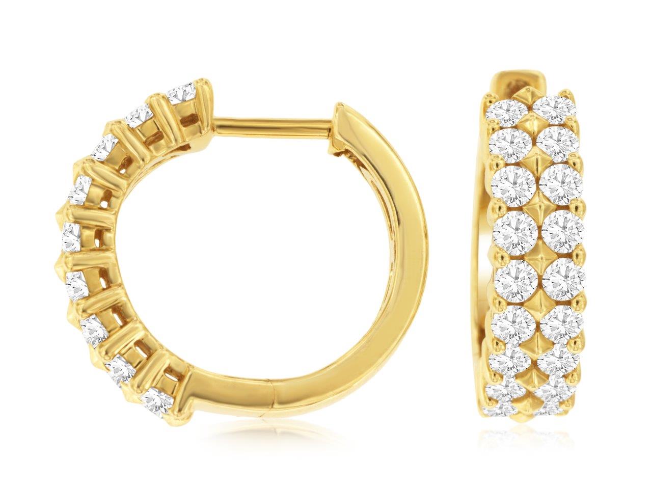 Elegant yellow 14 karat gold huggie earrings featuring a sophisticated double row design with prong-set round diamonds totaling 1.43 carats. These versatile hoops offer a refined sparkle perfect for everyday wear or special occasions. The secure prong setting ensures your diamonds stay brilliantly positioned, while the classic yellow gold complements any skin tone. A timeless investment piece that combines luxury with wearable comfort.