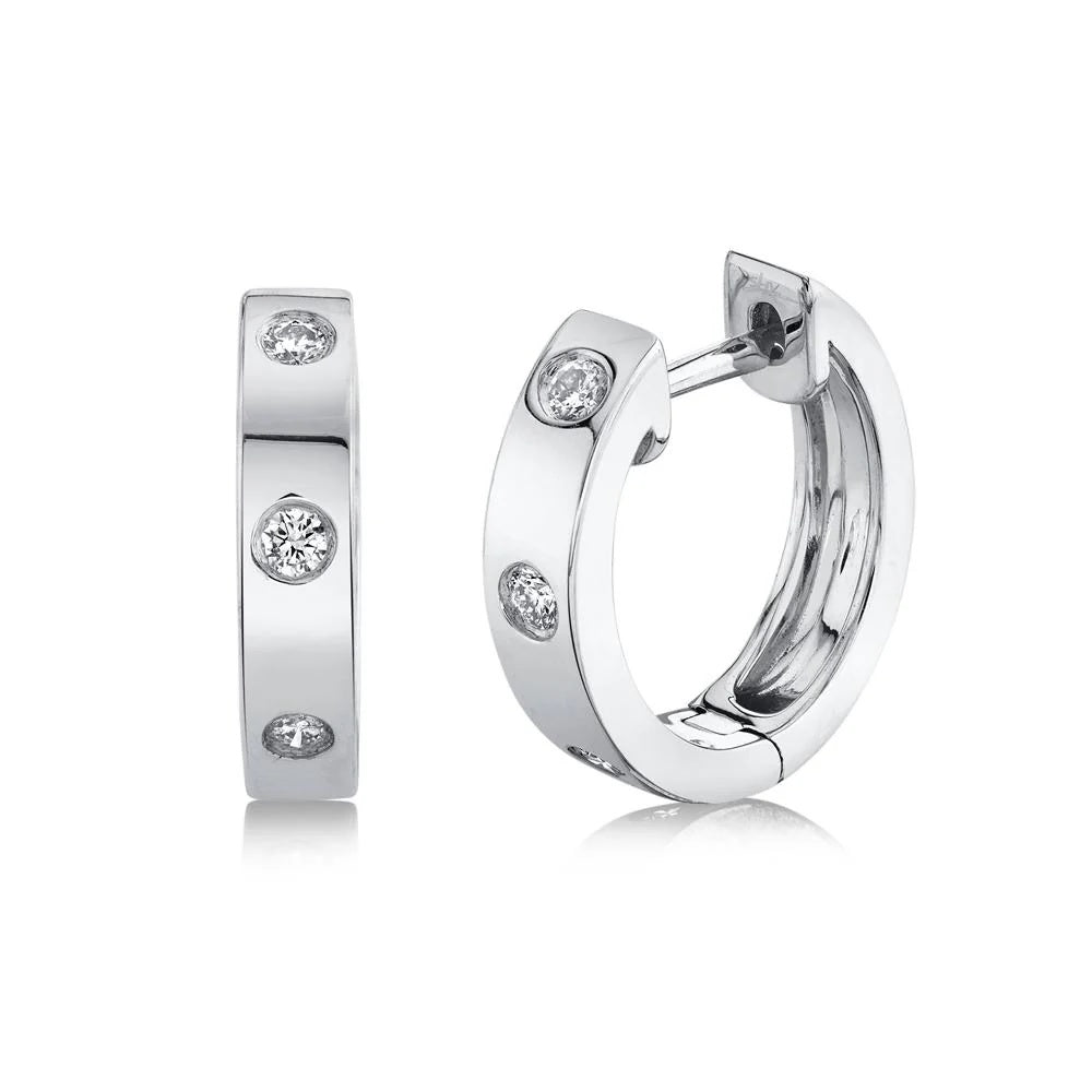 Discover refined elegance with these 14K white gold huggie earrings featuring bezel-set diamonds that hug the earlobe with understated sophistication. The 0.11 carats of round diamonds are individually encircled in protective bezels, maximizing security while creating a continuous line of sparkle around each earring. The rhodium finish delivers a bright, mirror-like polish that resists tarnishing and maintains its luminous appearance indefinitely. The compact huggie design offers comfortable, secure wear suitable for all-day styling without sacrificing visual impact. Perfect for those seeking versatile luxury that transitions seamlessly from professional environments to evening occasions.