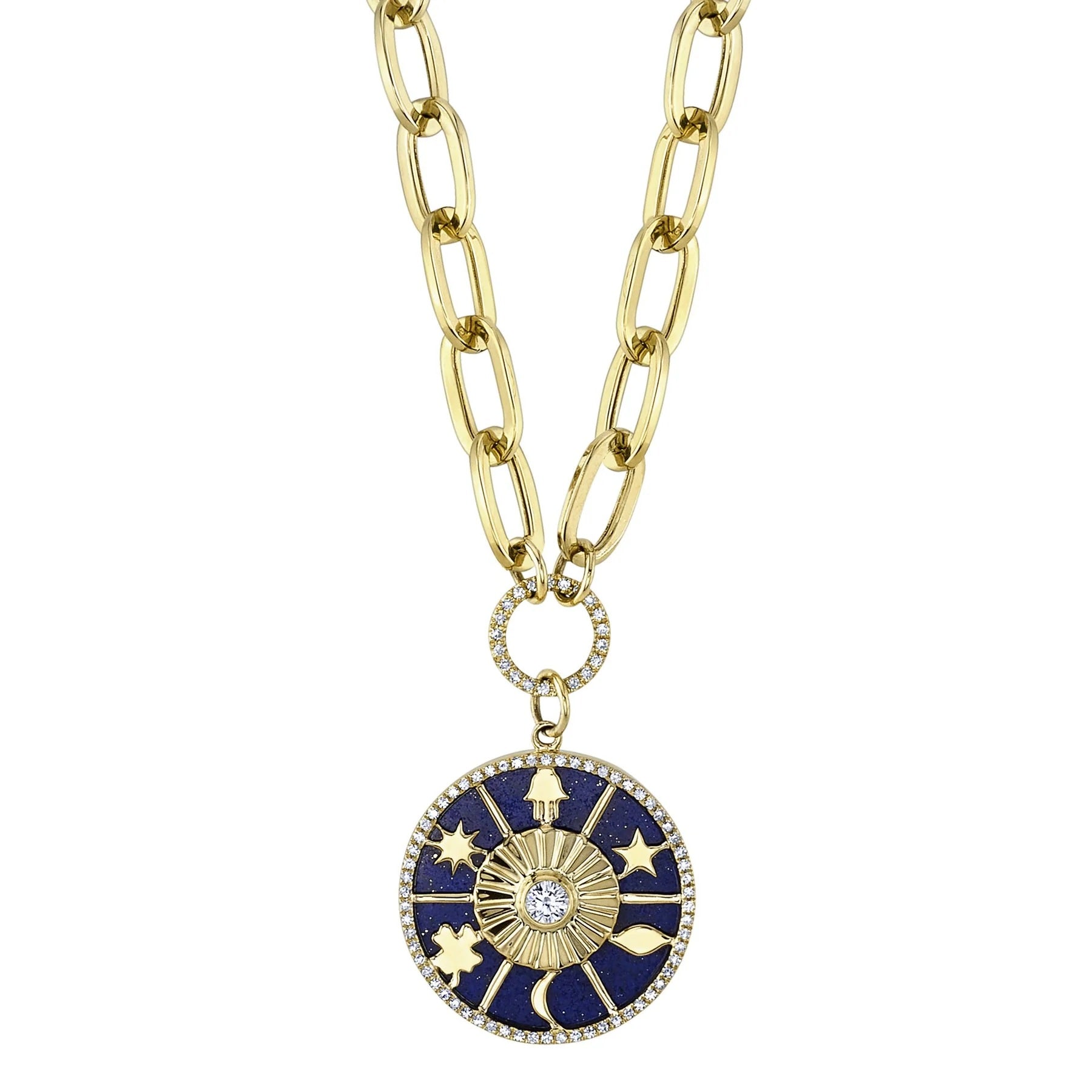 Diamond & Lapis, Hamsa, Moon, Star & Sun Necklace