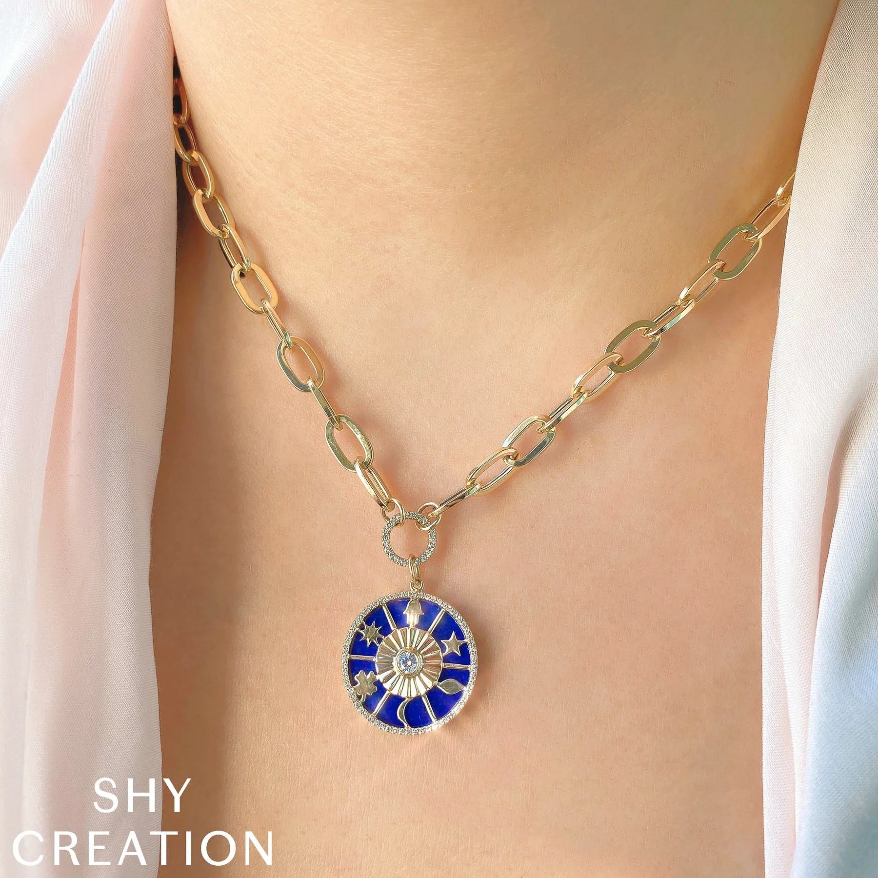 This exquisite 14K yellow gold necklace combines symbolic charm with refined elegance. Featuring a delicate paperclip link design, it showcases iconic motifs—the clover, Hamsa, moon, star, and sun—each representing protection, luck, and guidance. Centered on the chain is a striking 4.43-carat round lapis gemstone, accentuated by 0.24 carats of sparkling round diamonds. Perfect for those seeking a meaningful piece blending fine craftsmanship with timeless style.