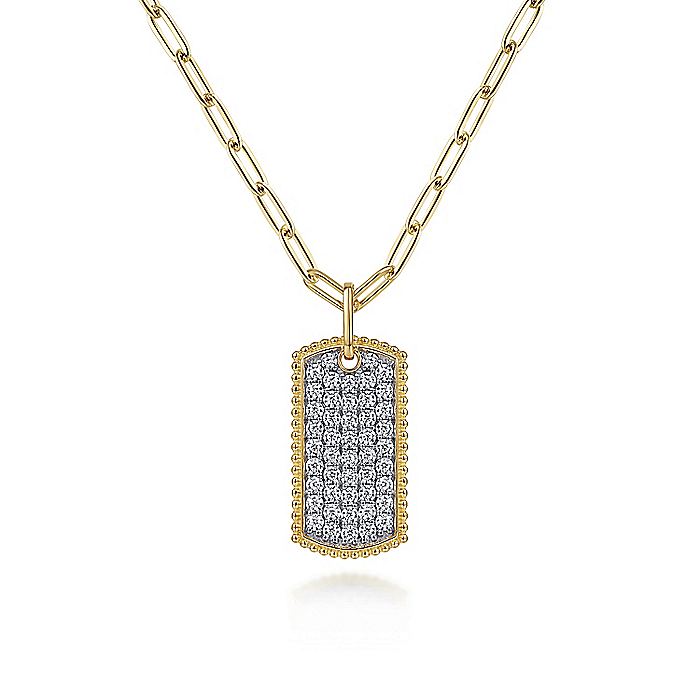 Perfectly Balancing The Masculine And Feminine Aesthetics, This Dog Tag Necklace Is A Striking Signature Accessory. The 14K Yellow Gold Chain Boasts Elongated Oval Links, Leading To A Classic Dog Tag Pendant. Shining Golden Spheres And 0.67Cts Of Pavé Diamonds Expertly Elevate A Familiar Silhouette.