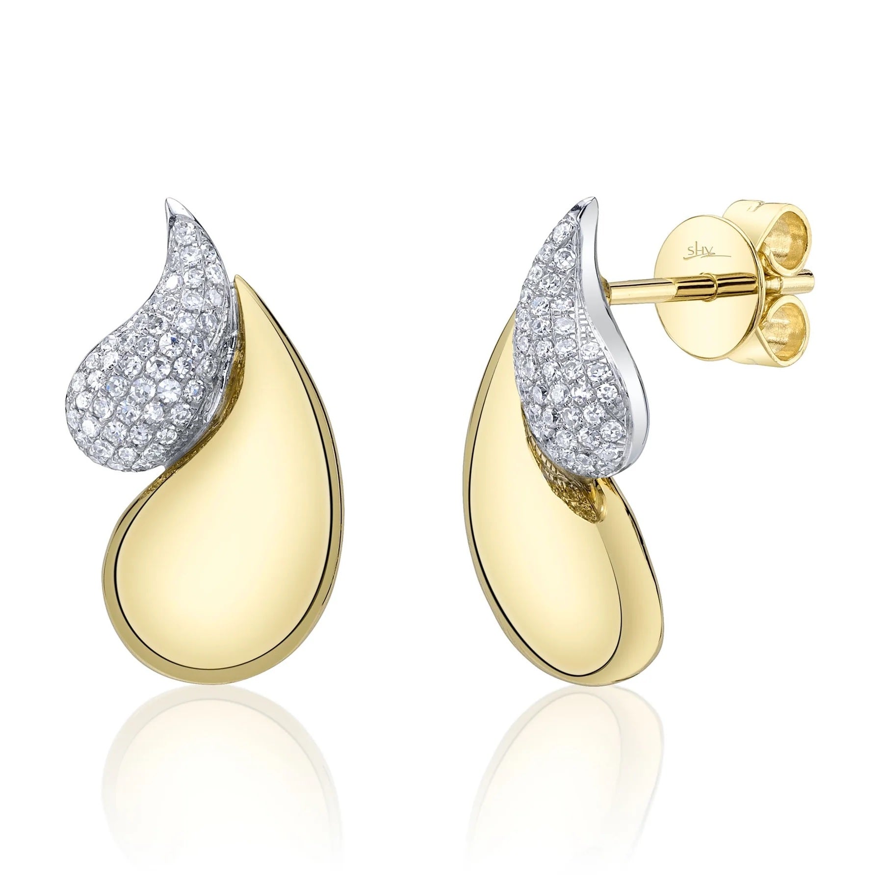 These two-tone 14-karat gold teardrop stud earrings feature 0.24 total carats of round diamonds set in a pave style. The combination of metals enhances their visual depth, while the pave setting ensures a continuous sparkle. Expertly designed, these earrings offer a refined and versatile elegance suitable for both everyday wear and special occasions.