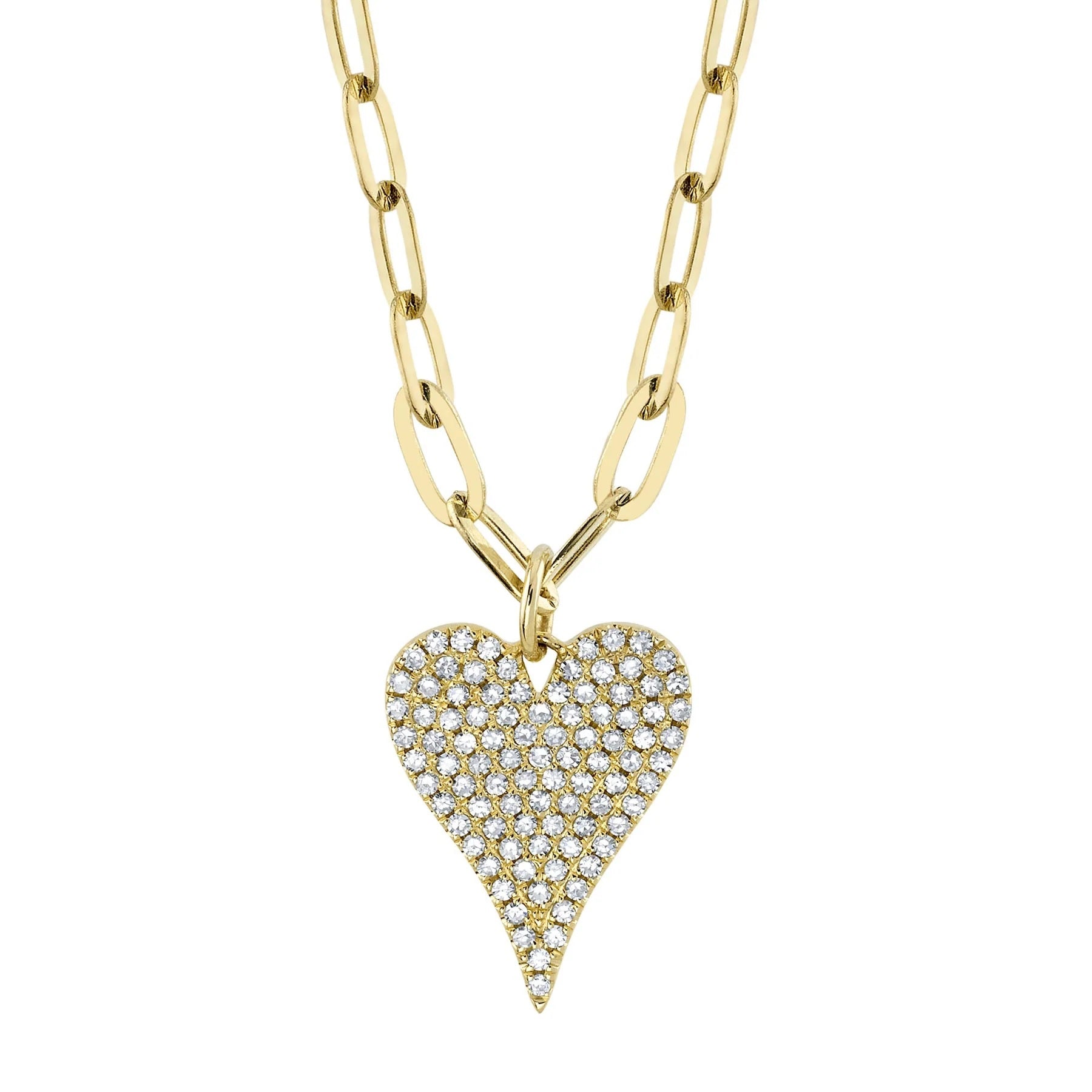 This sophisticated yellow 14 karat gold necklace merges contemporary design with timeless romance. The striking paperclip chain showcases a pavé-set heart pendant adorned with 0.21 carats of round diamonds, creating a luminous focal point with exceptional brilliance. The 18-inch length offers versatile styling options, whether worn as a standalone statement or layered with complementary pieces. Expertly crafted with secure pavé settings and polished yellow gold, this necklace delivers both modern edge and classic elegance—an investment piece that captures attention and endures through seasons of wear.