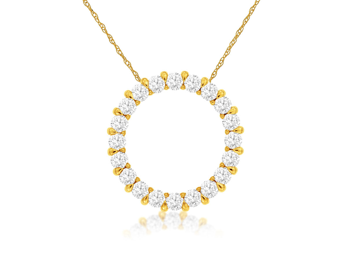 Elegant 14K yellow gold pendant featuring a circular design with prong-set gemstones and 0.50 carats total weight of sparkling round diamonds. The adjustable spring ring closure and slide bail allow for versatile styling, while the 18-inch chain length offers a flattering drape. Perfect for everyday wear or special occasions, this timeless piece combines classic design with brilliant sparkle.