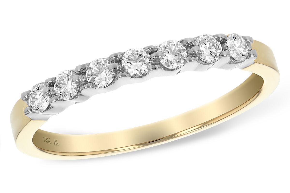 Elevate your bridal collection with this sophisticated two-tone wedding band from Allison-Kaufman. Crafted in 14 karat gold, this design features 0.12 carats of round diamonds set in a shared prong setting that maximizes brilliance while maintaining an elegant, streamlined profile. The contrasting white and yellow gold creates a timeless aesthetic that complements any engagement ring. Perfect for those seeking a refined band that balances classic design with contemporary craftsmanship.