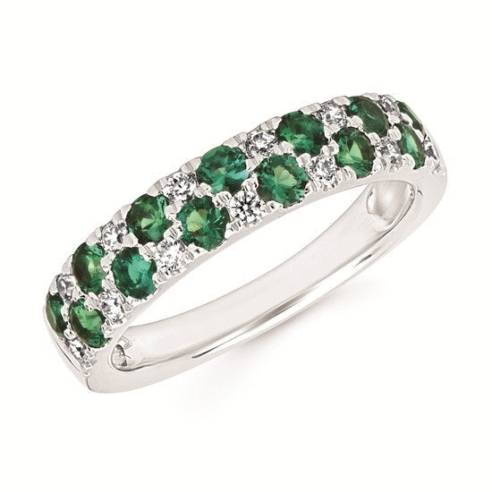 Elevate your jewelry collection with this sophisticated white 14 karat gold fashion ring, featuring an exquisite double row design. The piece showcases 0.20 total weight of brilliant round diamonds alternating with 1.04 total weight of vivid round emeralds, creating a striking contrast of sparkle and color. The alternating gem pattern adds visual interest and dimension, making this ring a versatile choice for both everyday elegance and special occasions. Expertly crafted to showcase the natural beauty of both gemstones, this ring combines timeless design with contemporary flair.
