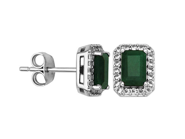 These sophisticated earrings showcase genuine emeralds in a classic emerald cut, set in rhodium-plated sterling silver and surrounded by brilliant white topaz accents. The topaz halo amplifies the emerald's rich green saturation while adding luminous sparkle and dimensional depth. The rhodium plating enhances the silver's brightness and ensures lasting durability. Designed for those who appreciate emerald's legendary prestige and refined gemstone artistry, these earrings combine timeless elegance with contemporary design sensibility, making them versatile enough for both everyday sophistication and special occasions.