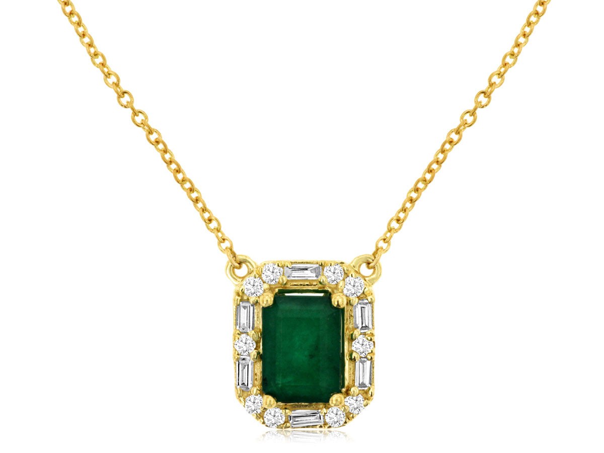 Elevate your elegance with this stunning 14K yellow gold pendant featuring a radiant 1.00 carat emerald at its heart, beautifully framed by a sparkling halo of 0.19 carats of diamonds in various cuts. The classic cushion prong setting showcases the emerald's rich, verdant allure while the surrounding diamonds amplify its brilliance. Suspended on an 18-inch fixed chain, this timeless piece transitions effortlessly from everyday sophistication to special occasion glamour. A true investment in refined style.