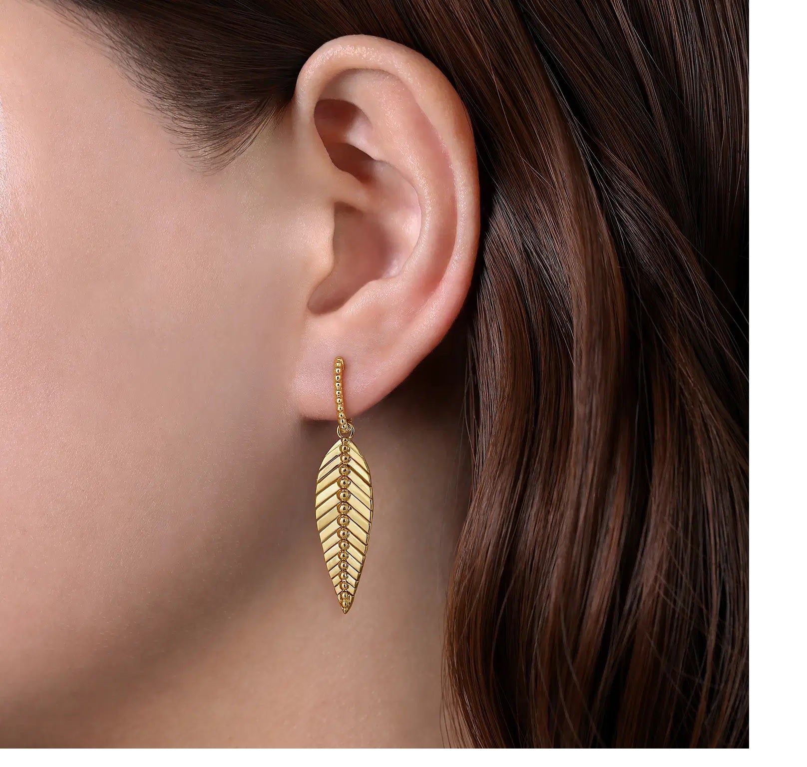 Floral - 14K Yellow Plain Gold Huggie Drop Leaf Earrings