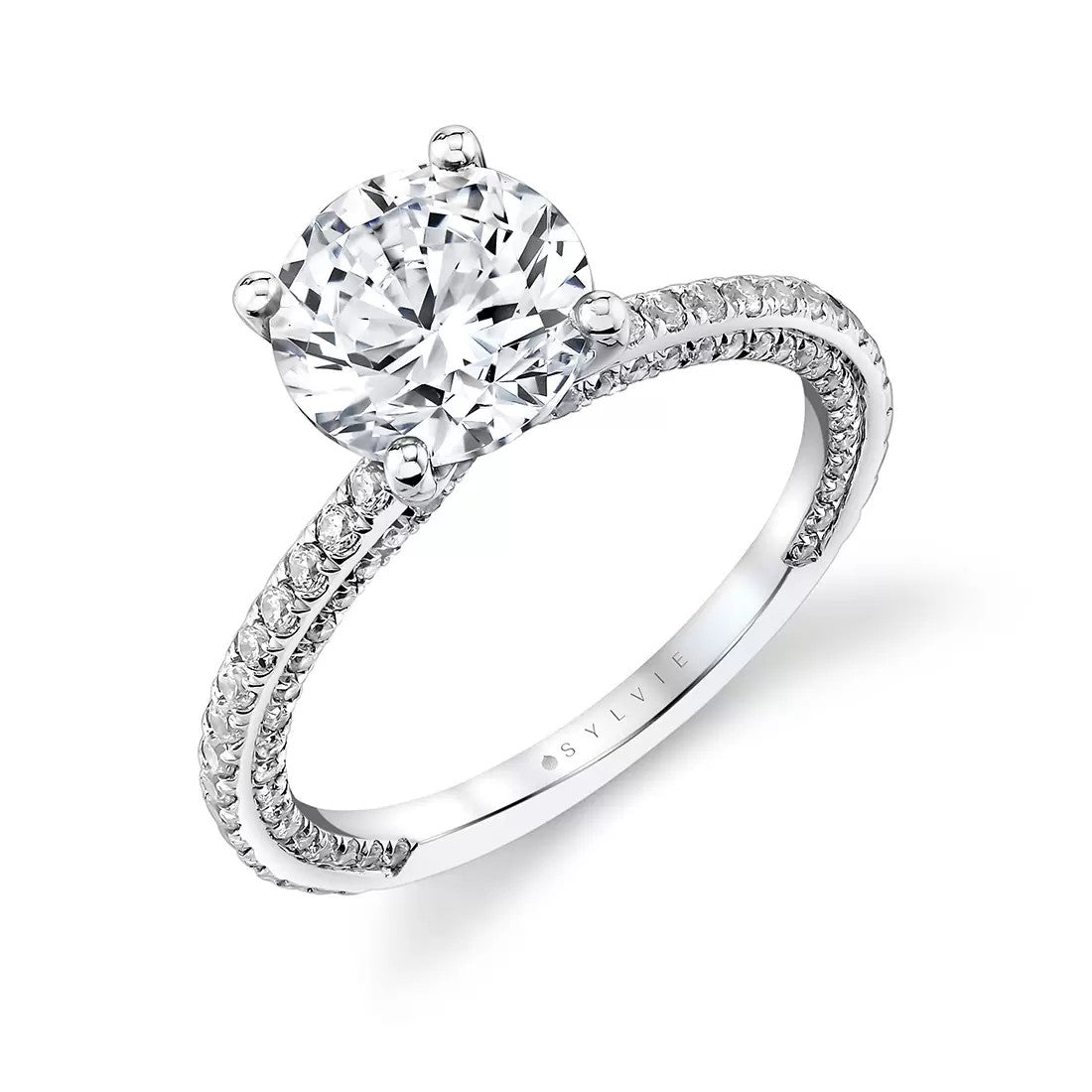 This Iconelle engagement ring features our signature Shell Iconelle Inlay encrusted with diamonds and Shell Tip Silhouette accents at the 3/4 mark of the band.*Price does not include the center stone