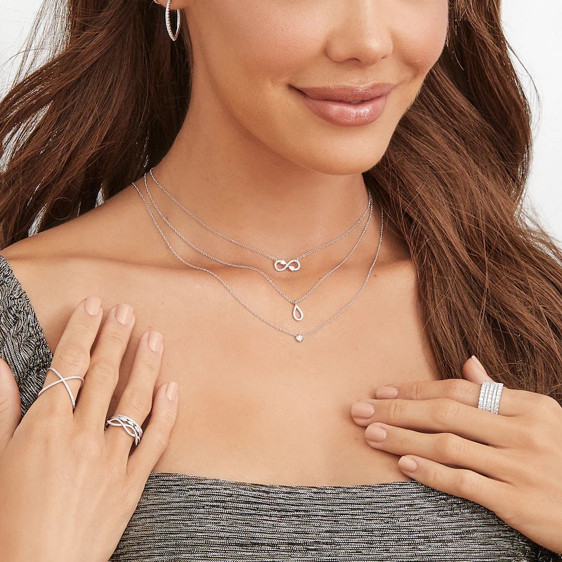 A Meaningful Infinity Symbol Traced In Brilliant Round Diamonds Is Punctuated With Two Dazzling Pear-Shaped Diamonds In This Vibrant Women's Necklace From Shy Creation®. The Pendant Has A Total Diamond Weight Of 1/5 Carat And Fashioned In 14K White Gold. The Pendant Suspends From A Rolo Chain That Adjusts At 15-, 16-, 17- And 18 Inches In Length, And Secures In Place With A Lobster Clasp.