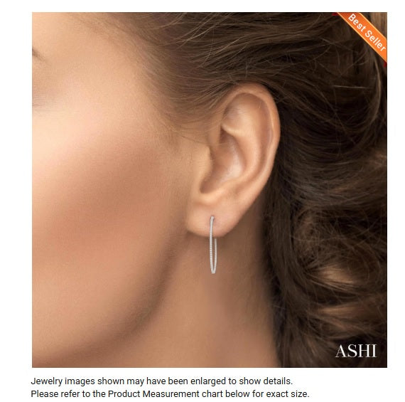 Sleek and gorgeous, this diamond hoop earring is a must have. It is lavish and offers an enchanting look, with its breathtaking layout of round cut diamonds on the outside, as well as on the inside of the earring, along the inner back. This spread out gives the hoop earrings a grand in and out diamond look. The stunning layout makes the earrings showy and a certain envy for other women. There is a total of 160 prong set round cut diamonds adorning the hoops, 80 diamonds on each hoop. The diamond hoop earring is styled in a polished rhodium finish 14 karat white gold. Total diamond weight is 3 Ctw.