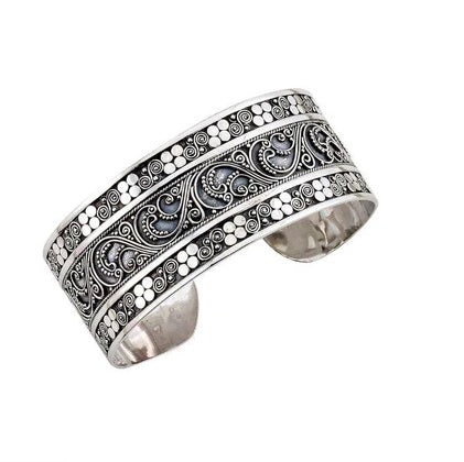 Our Sterling Silver Balianese Center Paisley Swirl Design Wide Cuff Bangle, Handcrafted In Bali By Our Skilled Artisans. From Our Thai Tribal™ Collection, A Completely Artisan Crafted, Intricate, Sterling Silver Collection Inspired By The Dreamscapes Of Thailand.