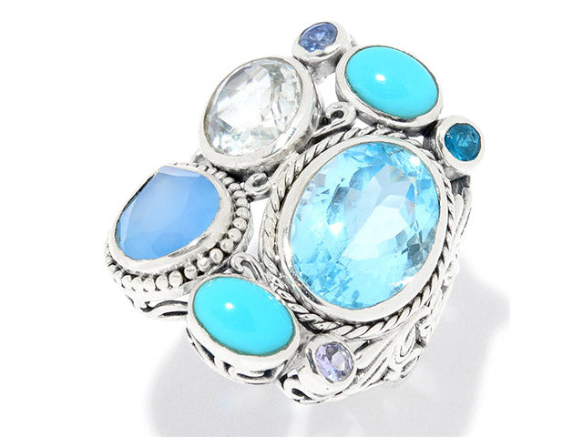 Our Sterling Silver multishape blue topaz & multi stone ring, handcrafted in Bali by our skilled artisans. From our signature collection, Royal Bali™ featuring designs handcrafted using sterling silver, solid 18k gold accents and genuine gemstones. The November birthstone, Topaz, symbolizes love and affection. It is believed to give the wearer increased strength and intellect.