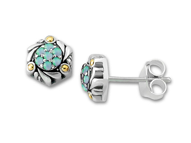 These exquisite stud earrings showcase opal, the revered October birthstone, set in a harmonious blend of sterling silver and 18 karat gold. The pave setting features meticulously arranged gemstones that frame the opal and enhance its characteristic color-play and luminescence. Designed for those who cherish opal's unique optical phenomena or seek meaningful birthstone jewelry, these earrings combine traditional symbolism with refined craftsmanship. The dual-metal composition ensures versatility across various styles and occasions, making them a distinguished choice for the discerning jewelry collector.