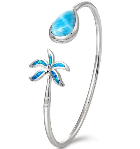 Embrace the tropical vibes with our Palm Tree Bangle! Crafted with white sterling silver, this bangle features open palm tree design with abalone leaves and a stunning pear larimar stone. Inspired by the ocean, it is designed by Alamea. Elevate your accessory game with this unique and exotic bracelet.