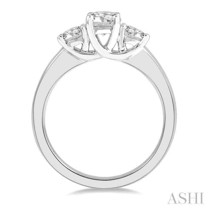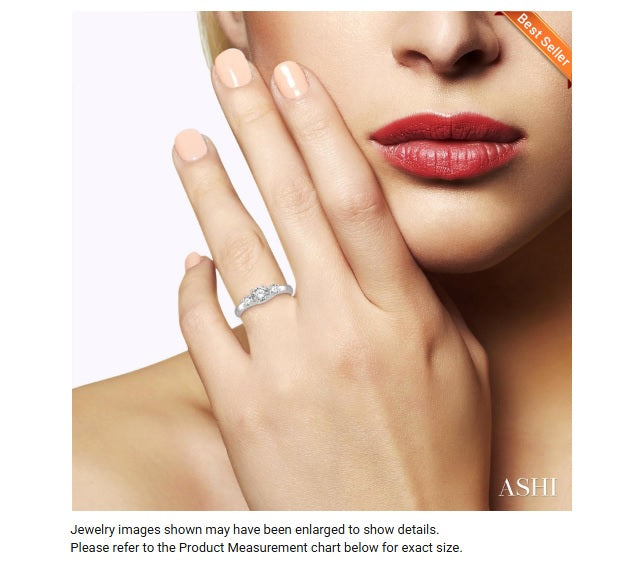 A beautiful diamond ring, this offers an eye-catching look even in its simplicity. It features a three-stone centerpiece and a plain gold shank. The round cut center stone in the middle, weighing 3/8 Ctw, rests slightly higher than the two stones flanking it. Each of these flanking round cut center stones, weighs 1/6 Ctw. A wedding band that can win many hearts instantly, this is crafted in a rhodium finish 14 karat white gold. The total diamond weight is 3/4 Ctw.