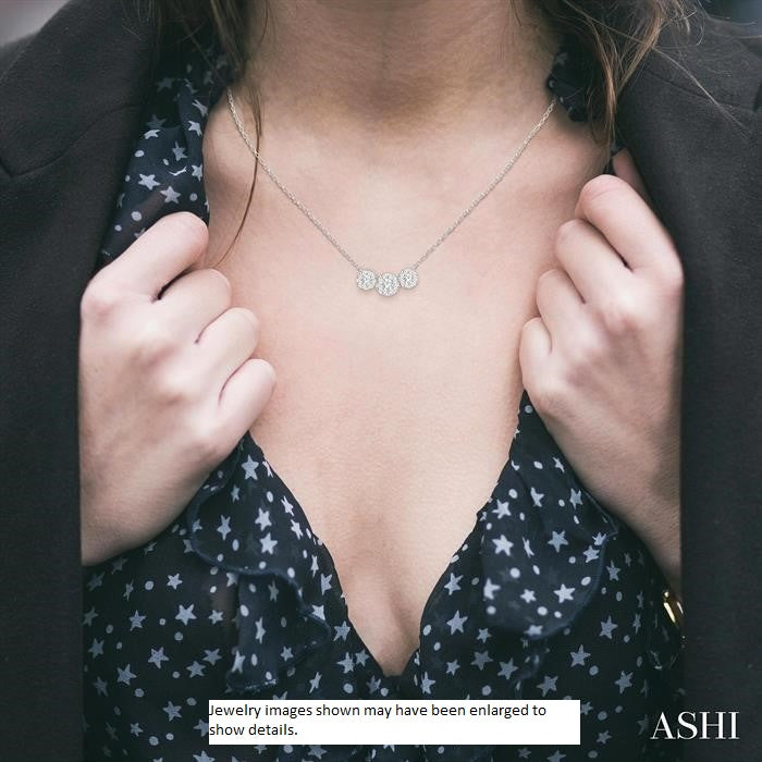 Even The Simplest Of Lovebright Diamond Necklaces Offer Elegance, And This One Is No Exception To It. A Triple Circular Mount Necklace, With A Large Mount In The Center Flanked By A Smaller Circular Mount On Either Side, Is Seen Featured Here. A 1/6 Ct Round Cut Diamond Sits In The Center On The Large Mount, While 8 Round Diamonds Surround It. Similarly, A 1/10 Ct Round Diamond Each Decorates The Center Of The Two Smaller Mounts, And Is Each Haloed By 8 Diamonds. All Diamonds Are Invisible Sets. A Lobster Lock And An 18-Inch Cat Chain Are Attached To The Necklace. The Necklace Is Styled In 14-Karat White Gold. The Total Diamond Weight Is 3/4 Ctw.