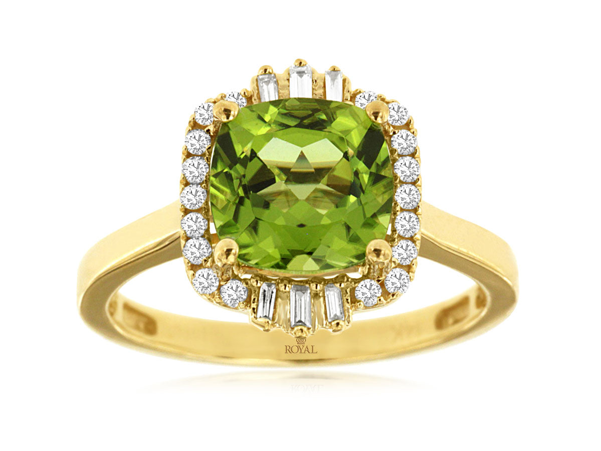YELLOW 14 KARAT FANCY HALO PRONG SET CENTER RING SIZE 7 ONE 2.05CT CUSHION PERIDOT