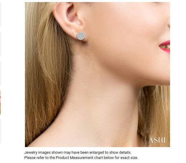 A simple design made beautiful with diamonds, this fashion earring from the trending Petite Collection catches the eye instantly. It features a disc shape mount that forms the body of the earring. The disc top is embellished with round cut diamonds, while push-back earnuts offer a secure closure. Each earring displays a diamond in the middle, with two rows of diamonds encircling it, 6 in the inner row and 13 on the outer row, a total of 40 pave set round cut diamonds on the earring pair. The Petite diamond fashion earring is framed in a rhodium finish 14 karat white gold. Total diamond weight is 1/8 ctw.