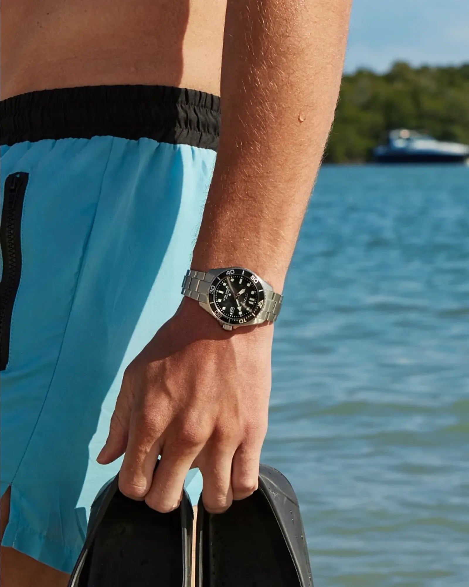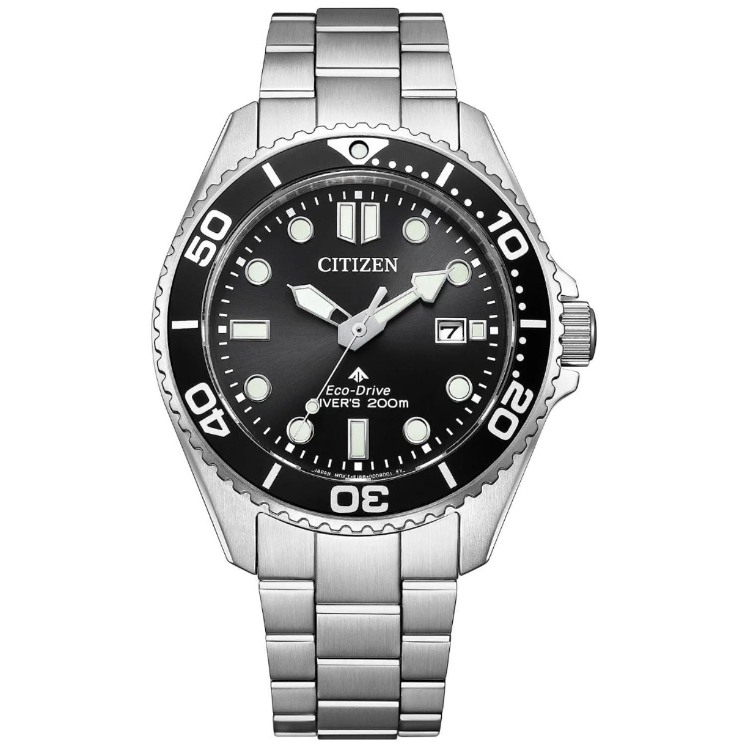 Good looks meet dive-ready functionality in the latest Promaster Dive timepiece. Comfortable on the wrist at 41mm in silver-tone stainless steel, this handsome tool watch is secured to the wrist via a matching triple-link bracelet and stylized in wear via a black unidirectional bezel. The sunray black dial hosts the highly visible applied hour markers, with plenty of lume and a unique handset easily showcases the time no matter the lighting conditions. A subtle date window at the 3 o'clock position provides daily utility. Featuring our Eco-Drive technology – sustainably powered by light, any light. Never needs a battery. This high-performance watch includes a wetsuit extender that doubles as a tool-less micro adjust, is ISO compliant and water resistant up to 200 meters, and comes in an exclusive dive tank box. Caliber number E168.