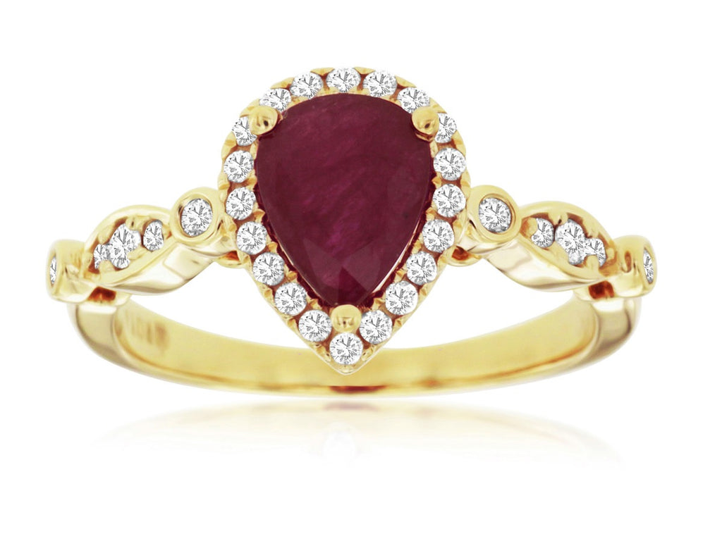 Expertly crafted, this yellow 14-karat tear drop halo ring boasts a stunning prong set design. Featuring a 0.25 carat pear-cut ruby and 1.12 carats of round diamonds, this ring offers a unique and elegant look. Perfect for any special occasion, this ring is sure to catch everyone's eye.