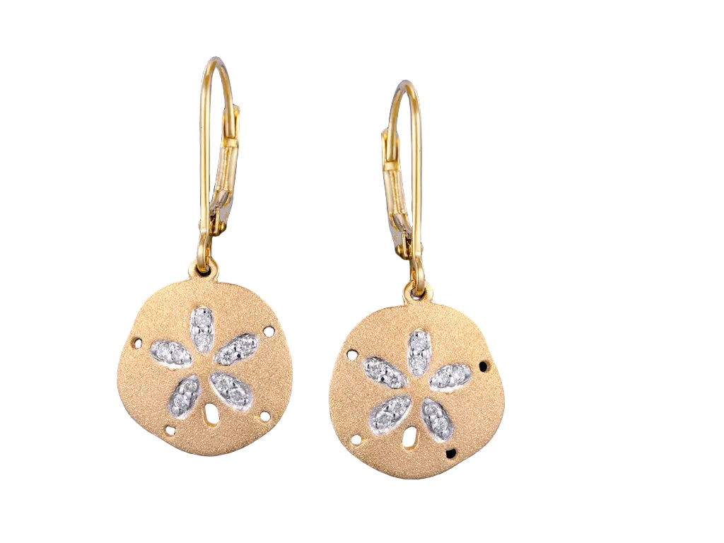 Elegant sand dollar dangle earrings crafted in 14 karat yellow gold, featuring a polished and sand blasted finish for sophisticated texture and shine. These 12mm earrings showcase a delicate sand dollar design with 0.08 total weight in diamonds, adding subtle sparkle. Secured with comfortable lever back closures for all-day wear. An exquisite design by Denny Wong that brings coastal-inspired elegance to any jewelry collection.