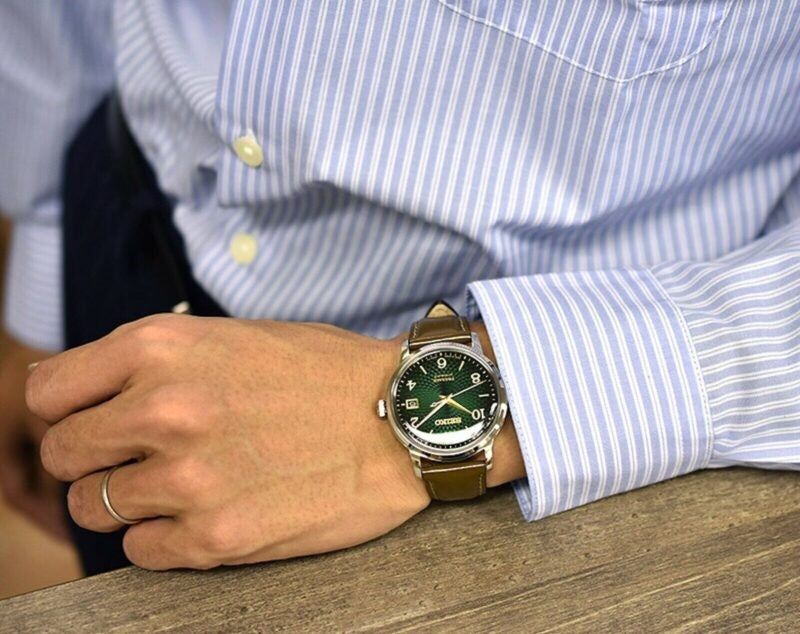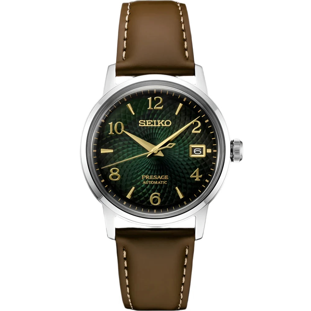 Silver-tone stainless steel case with a brown leather strap. Fixed silver-tone stainless steel bezel. Green dial with yellow gold-tone hands and Arabic numeral hour markers. Minute markers around the outer rim. Dial Type: Analog. Date display at the 3 o'clock position. Seiko Caliber 4R35 Automatic movement, containing 23 Jewels, bitting at 21600 vph, and has a power reserve of approximately 41 hours. Pull / push crown. Transparent case back. Round case shape, case size: 38 mm. Deployment with push button release clasp. Functions: date, hour, minute, second. Seiko Presage Series. Casual watch style. Watch label: Japan Movt. Seiko Seiko Presage Automatic Green Dial Unisex Watch SRPE45.