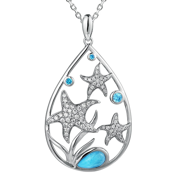 Celebrate island-inspired elegance with this sterling silver starfish pendant from Alamea's Hawaiian collection. The design features a captivating 4.00x2.00mm pear-shaped larimar stone, renowned for its serene blue tones and oceanic beauty. Accented with white and blue cubic zirconia stones, the pendant combines authentic gemstone sophistication with sparkling brilliance. Suspended from a 20-inch sterling silver chain, this piece captures the essence of tropical paradise while maintaining refined, wearable style. Perfect for those seeking meaningful jewelry that reflects a connection to the sea's natural splendor.