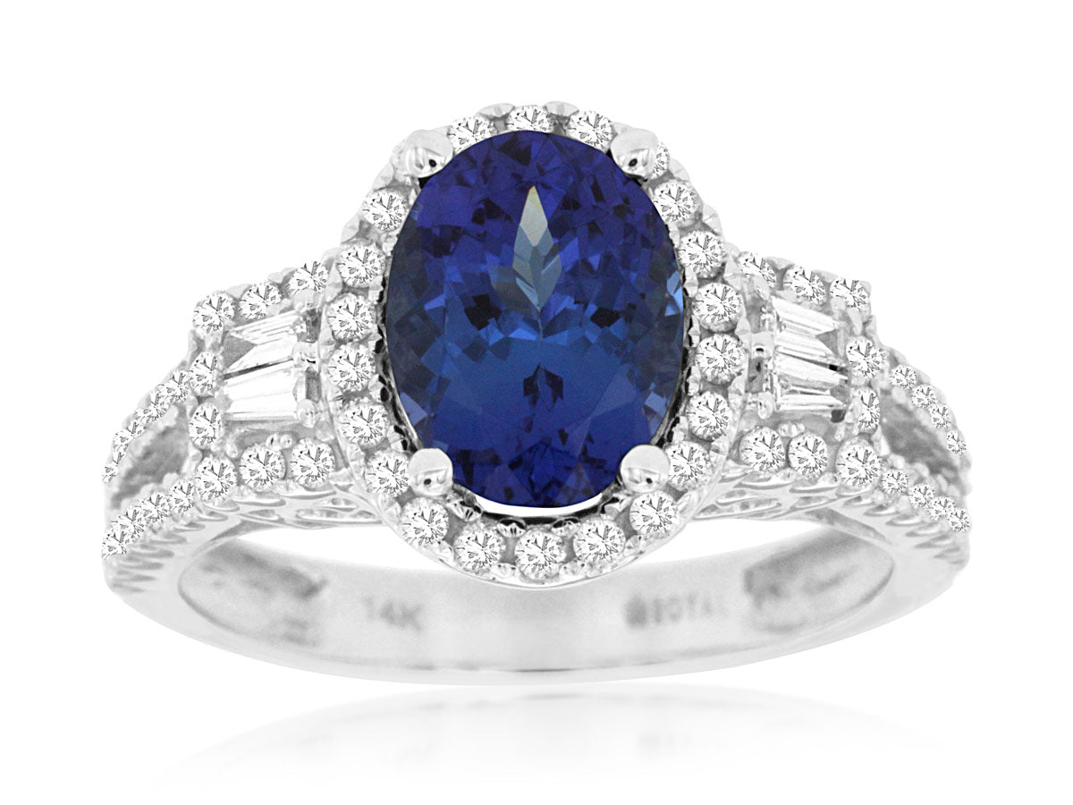 WHITE 14 KARAT GEMS ON HALO & SPLIT SHANK, FILIGREE BRIDGE RING SIZE 6.5 WITH ONE 2.00CT OVAL TANZANITE AND 72=0.58TW VARIOUS SHAPES H SI DIAMONDS