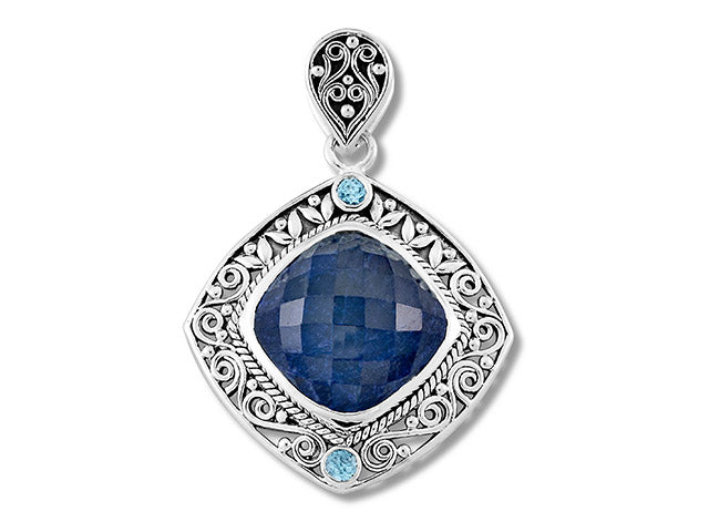 Our Sterling Silver Dyed Blue Corrundum Pendant With Blue Topaz Accents, Handcrafted In Bali By Our Skilled Artisans. From Our Signature Collection, Royal Bali™ Featuring Designs Handcrafted Using Sterling Silver, Solid 18K Gold Accents And Genuine Gemstones.