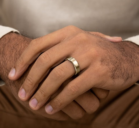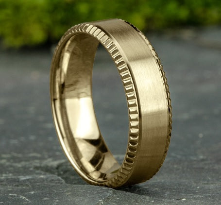 YELLOW 14 KARAT POLISH & SATIN BRUSHED CENTER COIN BEVEL EDGE WEDDING BAND SIZE 10 RING WIDTH IN MM: 7