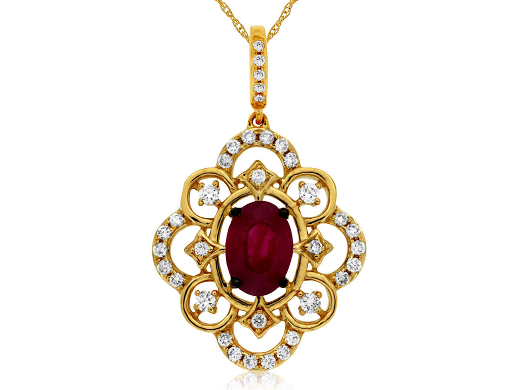 Elevate your style with our Vintage Ruby Pendant. Crafted in yellow 14 karat gold, this necklace features a beautiful 0.90 carat oval ruby surrounded by 0.24 carats of sparkling round diamonds. The vintage style and fancy gem accents add a touch of glamour to any outfit. Complete with a spring ring and 18-inch length for a secure and elegant wear.