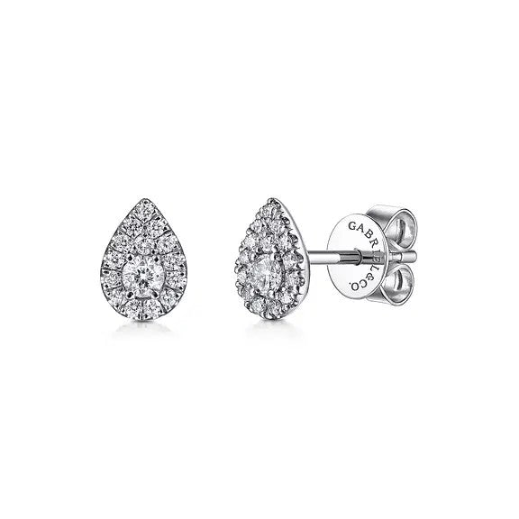 These white 14K gold pear-shaped diamond stud earrings feature a rhodium finish for lasting brilliance and protection. Each earring showcases a teardrop halo design with prong-set diamonds totaling 0.28 carats, crafted in various shapes to enhance sparkle. Designed by Gabriel New York, they offer a sophisticated blend of elegance and expert artistry, perfect for elevating any ensemble.