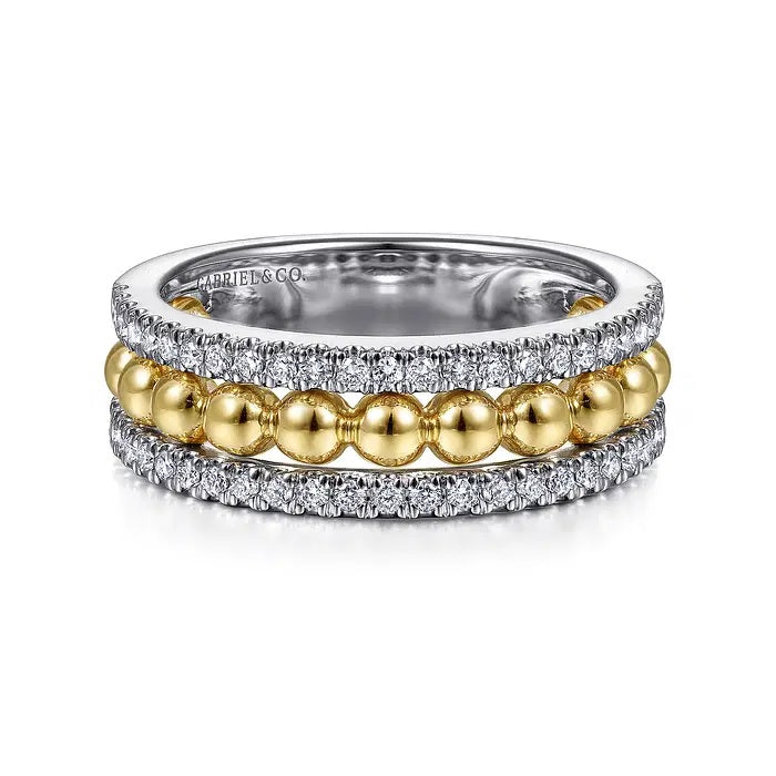 Achieve the appearance of three rings in one with this 0.36ct diamond stunner. Outer rows of twinkling pavé diamonds flank a central strand of beaded 14K yellow gold, creating that signature Bujukan look. Mixing metals has never looked so chic.