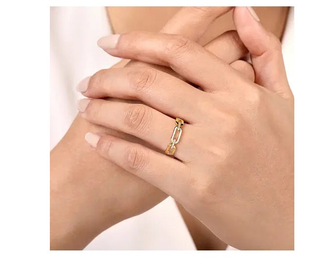 This elegant ladies' ring features a 14-karat yellow gold link chain design, accented with 0.04 total carat weight of round H/I color, SI2 clarity diamonds. Crafted by Gabriel New York, it combines classic craftsmanship with contemporary style, making it a refined choice for everyday wear or special occasions. Sized at 6, this ring offers both sophistication and subtle sparkle.