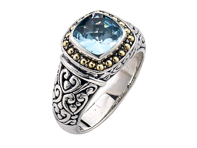 Our Sterling Silver 18k solid Gold ring with blue topaz and swirl design, handcrafted in Bali by our skilled artisans. From our signature collection, Royal Bali™ featuring designs handcrafted using sterling silver, solid 18k gold accents and genuine gemstones. The November birthstone, Topaz, symbolizes love and affection. It is believed to give the wearer increased strength and intellect.